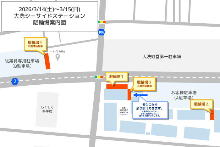 ・駐輪場は当施設をご利用の間のみ無料となります。駐輪場ご利用中にその他施設等へ行かれるお客様は、駐車料金3,000円(1台/日)を頂戴いたしますのでご注意くださいませ。